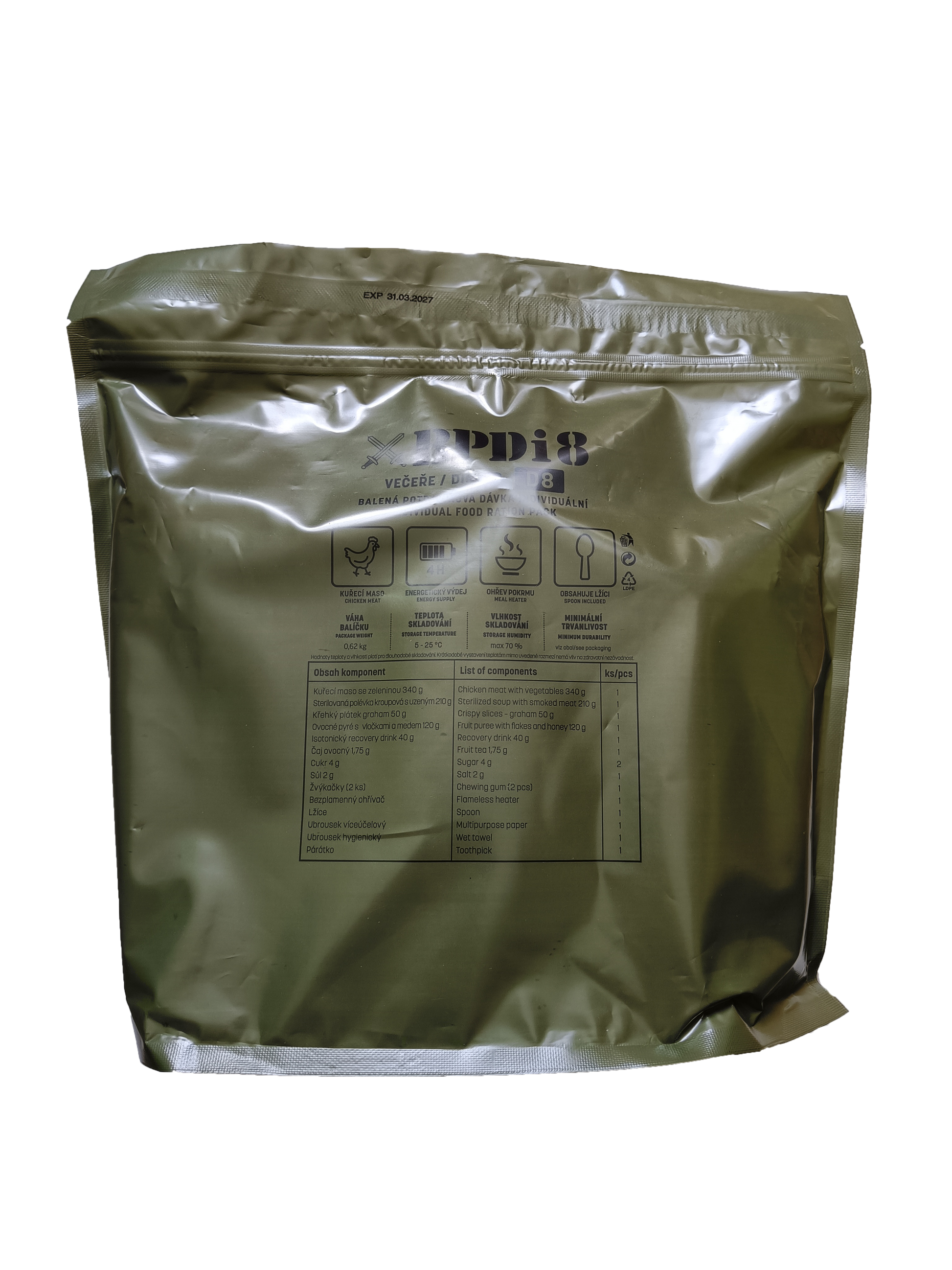 Set jídla na celý den se skládá z 5 pytlíků - Snídaně, obědu, večeře, PP-D a PP-C