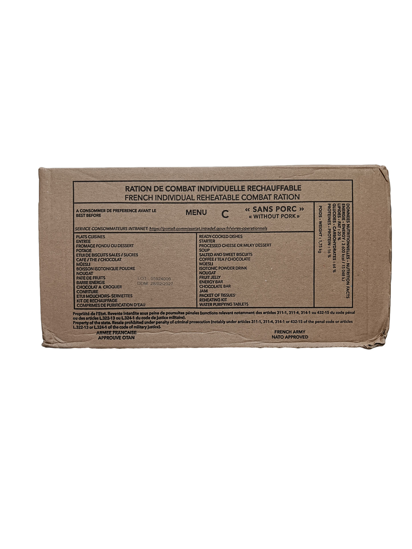 MRE jsou zabaleny v papírové krabici, kdy krabice je zabalena do průhledného plastového obalu, aby MRE splňovalo všechny parametry NATO proti poškození