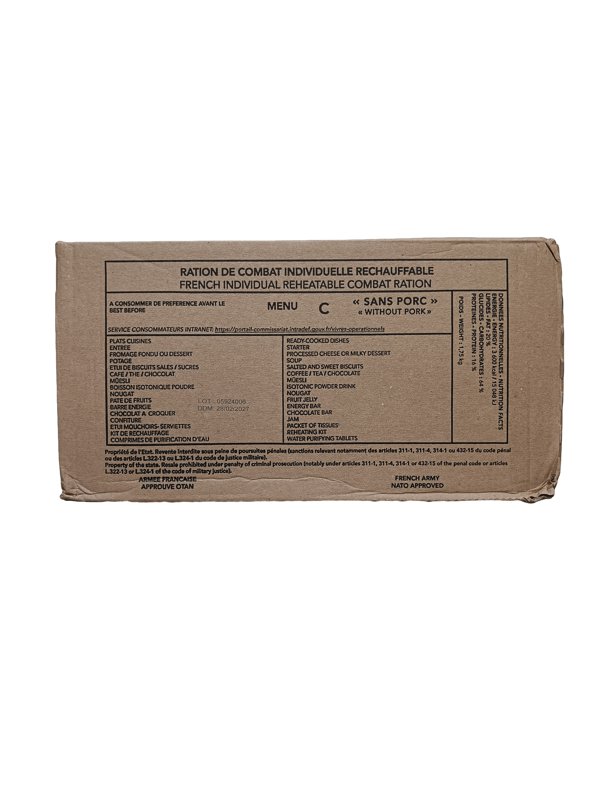 MENU C: Orientální salát, Kebabové karbanátky, Atlantický nimy, Polévka, Tavený sýr, Nápoj ke snídani (horká čokoláda, káva, čaj), Isotermický nápoj, Slaný, čokoládový cracker, karamely, nugát, ovocná ohřívací tyčinka, energetická tyčinka čokoládová smutná tyčinka, kapsle z čokoládové tyčinky, müsli tablety z vody a tablety z vody tablety, kapsle