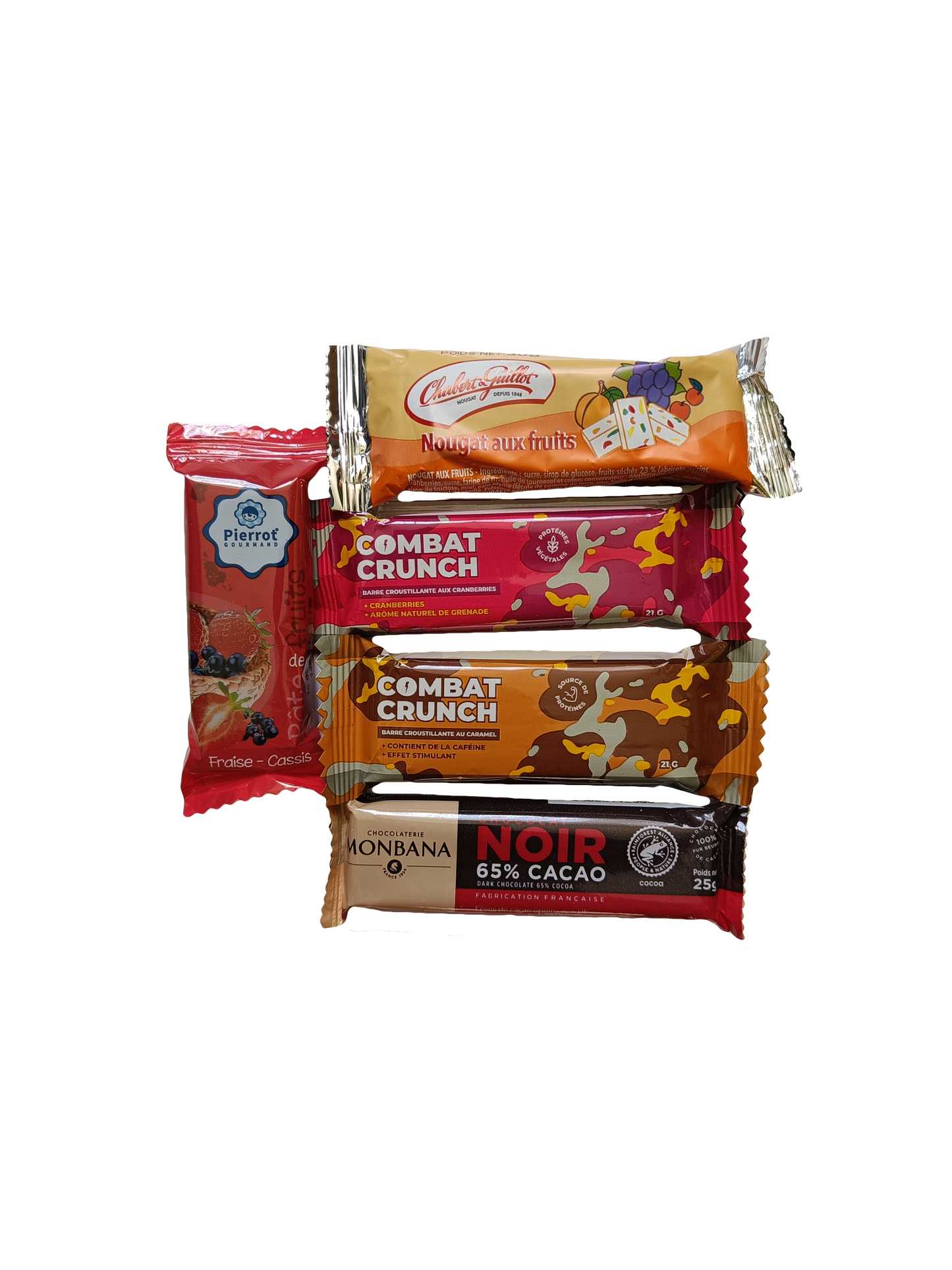 MENU E: Salát ze sušeného ovoce, Kachní parmezán, Jelení paštika s armagnacem, Polévka, Nápoj ke snídani (horká čokoláda, káva, čaj), Isotermický nápoj, Slaný, sladký a čokoládový cracker, karamely, nugát, ovocná tyčinka, energetická tyčinka, müsli, tablety a čokoládové tyčinky